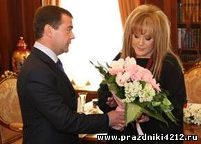 Президент Медведев в Кремле поздравил Аллу Пугачеву с 60-летием. В финале встречи именинница пригласила главу государства на банкет, но Дмитрий Анатольевич опередил артистку, предложив ей торжественный фуршет в Кремлевском кабинете. Ради такого случая певица на час забыла о диете, на которой сидит уже несколько недель  На встречу с главой государства именинница отправилась из дома: звезда была при полном параде. С прической и макияжем ей помог визажист Сергей Зверев, а праздничное платье Примадонна выбрала от Валентина Юдашкина.